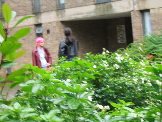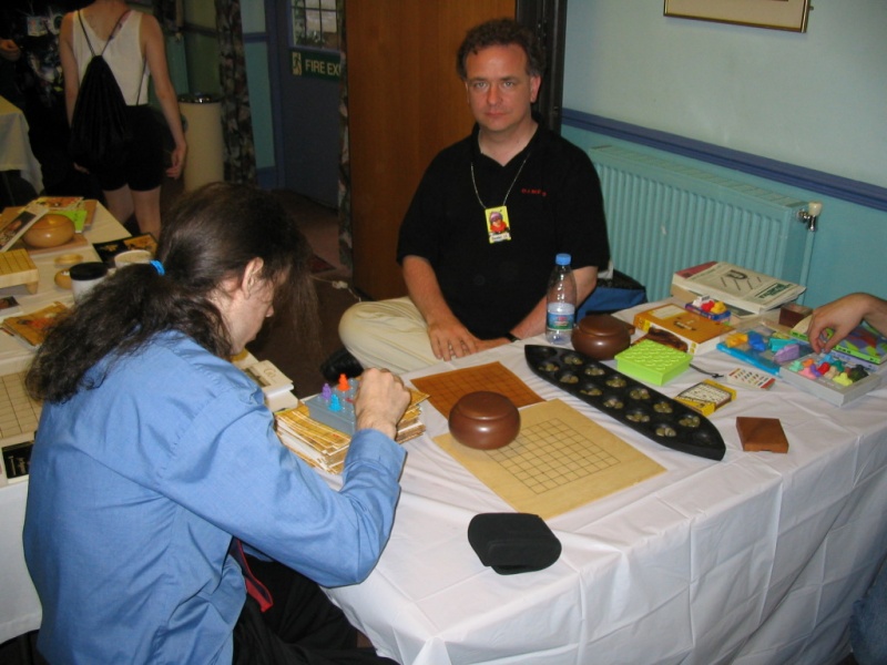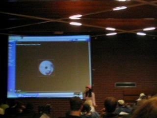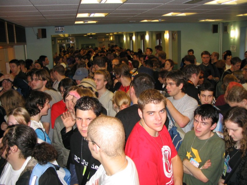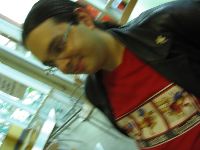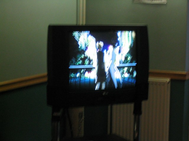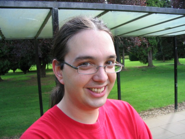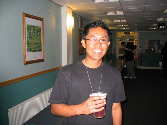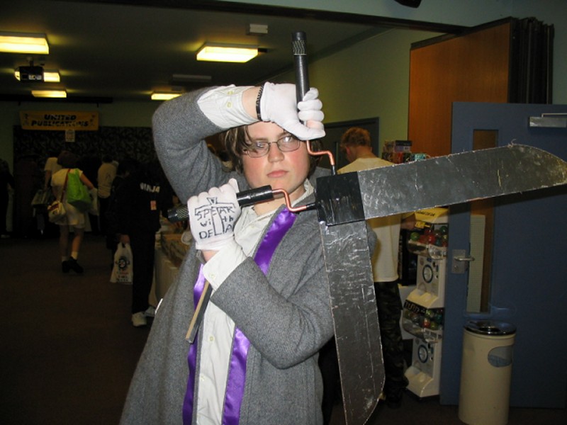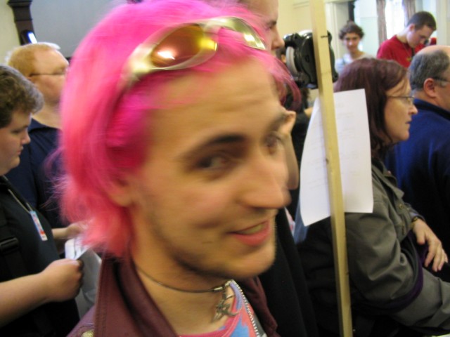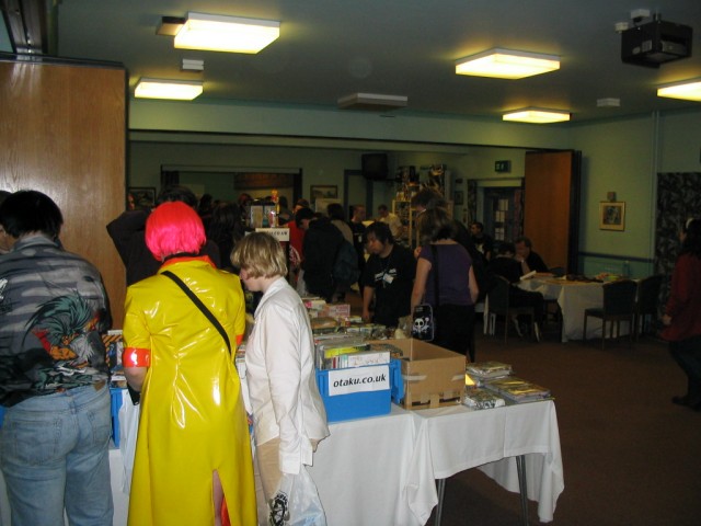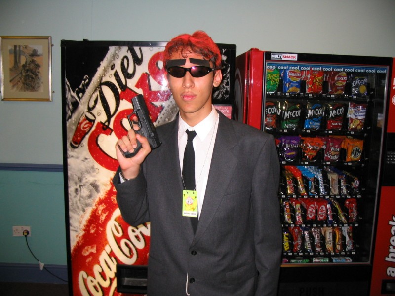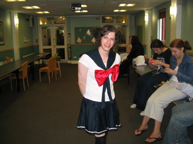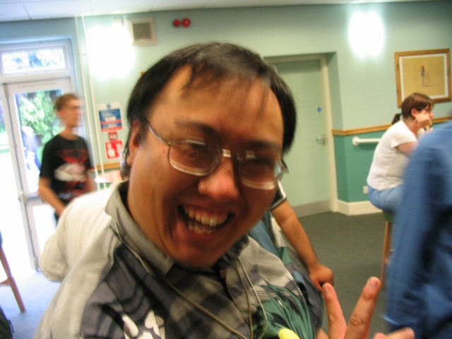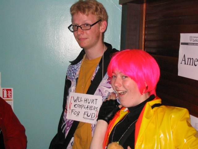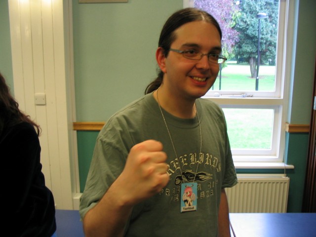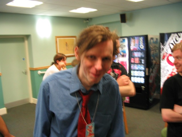 Friday We arrived at Amecon kind of super early, so the nearby people who were somewhat involved with running the convention told us to go to Asda. We went there and then bought snacks, and I took this picture of Toothball whilst pretending to test my camera or something. It's really blurry because I didn't really care and was just performing basic camera checks. In any case Toothball is normally a bit blurry. After returning from Asda, Toothball and I walked ahead. I snapped a pic of the rest of the slow walking people and of the general convention grounds which were very nice. The pic still came out a bit blurry because I was walking when I took it. The main hall with VR1 and the bar and some stuff. I didn't really have anything to take pictures of because it was still really early at this point. We went to eat snacks in the park area around the back. The sky was really nice at this point so I took a reference pic. A bit later it started raining like crazy, so I have no idea where it came from. Toothball and I played 'Dong Dong' on Warioware on the Gameboy advance which was later turned in to a comic which won a prize in the comic competition. It's very remarkable that someone should want to make a page comic about us playing with our dongs. First sighting of Hunter! Toothball caught up with him but I saw him before he saw me. I snuck round the back of some bushes to snipe a shot of him. Excellent work. Here he is again, this time from a nearby building. I'm getting good at sniping pictures. Okay, I think he noticed me this time. Hooray, I met Mangamad again! Unfortunately this pic is blurry. I don't like using flash because it makes the lighting in a picture look very bad (the background becomes very gloomy) so I try to avoid flash unless it's absolutely necessary. This means I have to have a steady hand a lot of the time, and I sometimes am not very careful. It's Tiger Tiger who flew down from Scotland with us. He is in cosplay here as that dude from Eva, I think. Another blurry pic because my hand is about as steady as a paint shaker. I think I took a picture of him because he didn't want his picture taken. Anyway, at this point the convention is starting to pick up and plenty of people are arriving. As far as I know, this is the person who drew the comic of the earlier donging. I used flash and it looks pretty depressing and dingy, sorry about that. Another cosplayer. At this point I was just sort of taking random pictures of cosplayers. The costume is good but I don't recognise the character. I think it might be Final Fantasy though. The guy at the left looks really worried about something. I hope it worked out for him. Toothball thrusts his fist in to the air in a victory pose. I have no idea what was happening at this point. Hooray, we snuck in to the dealer's room when they were setting it up. Actually we went in sort of by accident and before anyone kicked us out, we sat down at this excellent puzzle table hosted by a guy we only know as puzzle guy. It was really interesting and had plenty to do, I must have spent about 4 or 5 hours there all weekend. Unfortunately I think I was the only regular as his table seemed quite empty most of the time. Puzzle guy already looks tired and terrified, as he doesn't normally do anime conventions. Tiger Tiger is here playing the robots game. Danj and I met up then pushed to the front of the queue for the opening ceremony. It didn't really help us get good seats because they filled up seats from the back first, but I got a good picture of the hustle and bustle. The dealer's room opened! I'd already been there, but this time I of course decided to go in the legit way. I queued with Mangamad and Danj and I got bored enough to take a movie. You can watch it if you have the divx codec installed, but it isn't really worth it. After taking the movie I noticed this guy with his cool... costume thing. He also had a bloody shirt but he wasn't wearing it there. He also turned out to be a guy called Roomproject, if I'm not mistaken, who entered the quiz with us and helped us win and did pretty well in the manga competition too. Inside the dealers room I had no money, so instead I took a picture of this FLCL cosplayer of Amaro. He wore the costume all weekend and was cool. And then the priest guy from Hellsing (Anderson or something like that?) A bit dark, but it's a picture of the dealer's room. If you look carefully at the centre right, you can see Puzzle Guy looking stressed out. Ginji and Ban from GetBackers. It was the dub. I got to see it before it was out on DVD, I think. How special am I?! Well, I've already seen the whole series using the power of piracy anyway. There was some karaoke, so I went and listened to a couple. Generally people were quite good. This girl has a fairly strong voice, but more surprisingly the song she is singing is just completely whacked out. I don't know the title of the song, unfortunately. You need divx to watch this, by the way. After the silliness that ensued, I went to the fandub competition and the fandub panel. The competition was very makeshift as they really had no idea what to do, and basically ended up with teams of people coming up and shouting lines over Pretty Cure. I had a team of me, Toothball and a guy whose name was something like PLUNK (exactly what escapes me right now). We made fools of ourselves of course, and it was a good laugh. The fandubbing panel was about amateur voice acting, something I'd actually be interested in investigating. I'm walking behind Monica Rial in a corridor after the hilarious fandub contest and informative panel! THAT MEANS I'M FAMOUS! This guy's holding a pint in front of his BADGE! Great! Now I can't remember what his name is, but it began with 'M' and I could probably get it off the cache off the old Ikaruga scoreboard. This guy recognised by badge name off the Ikaruga scoreboard (which by the way has been down for the best part of a year at least). He seemed to be a bi